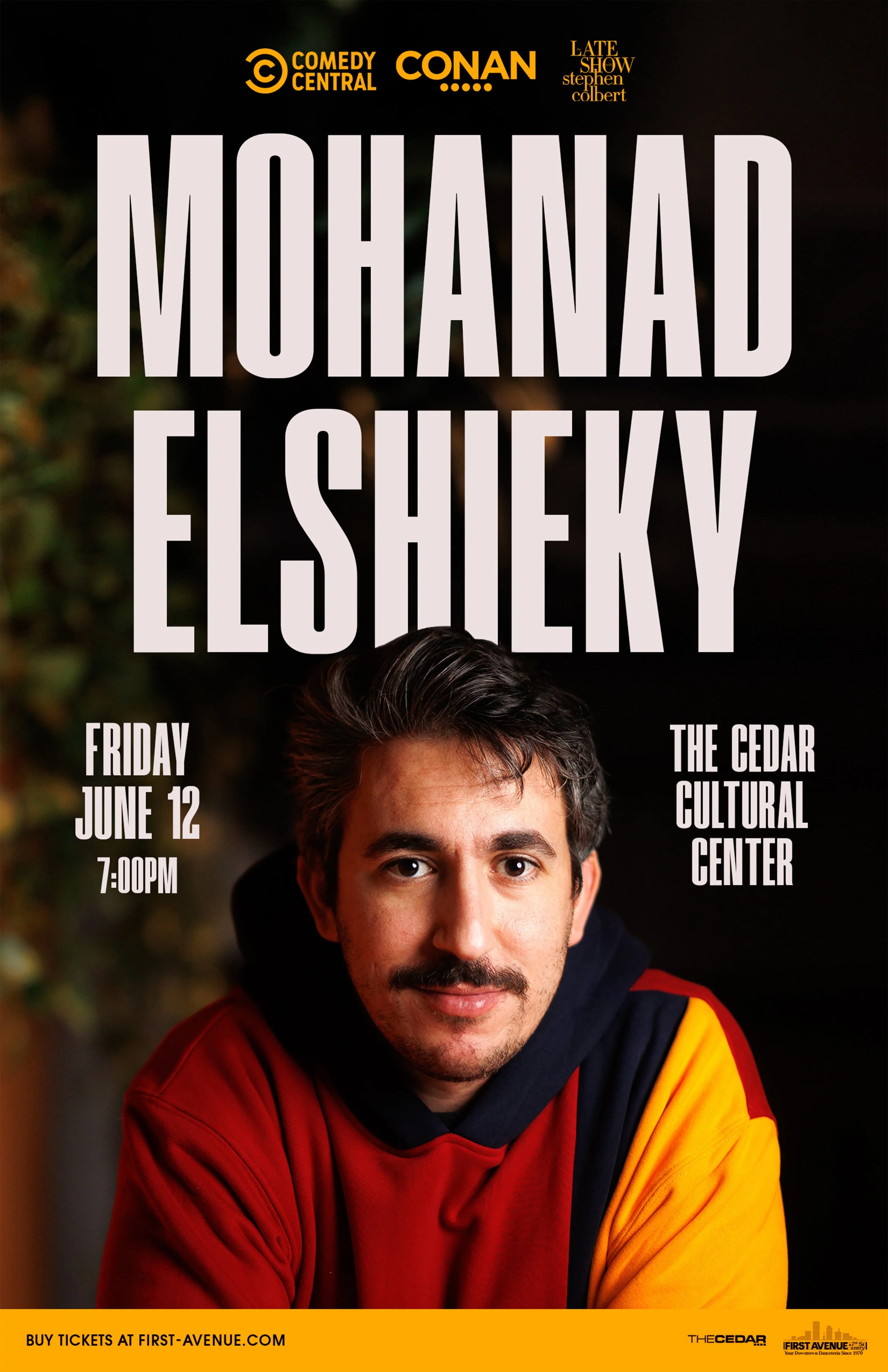 Mohanad Elshieky is a New York-based, Libyan-born comedian who made his national TV debut on Conan, has been featured on The Late Show with Stephen Colbert, Don’t Tell Comedy, Comedy Central, This American Life, and has toured with Pop Up Magazine.