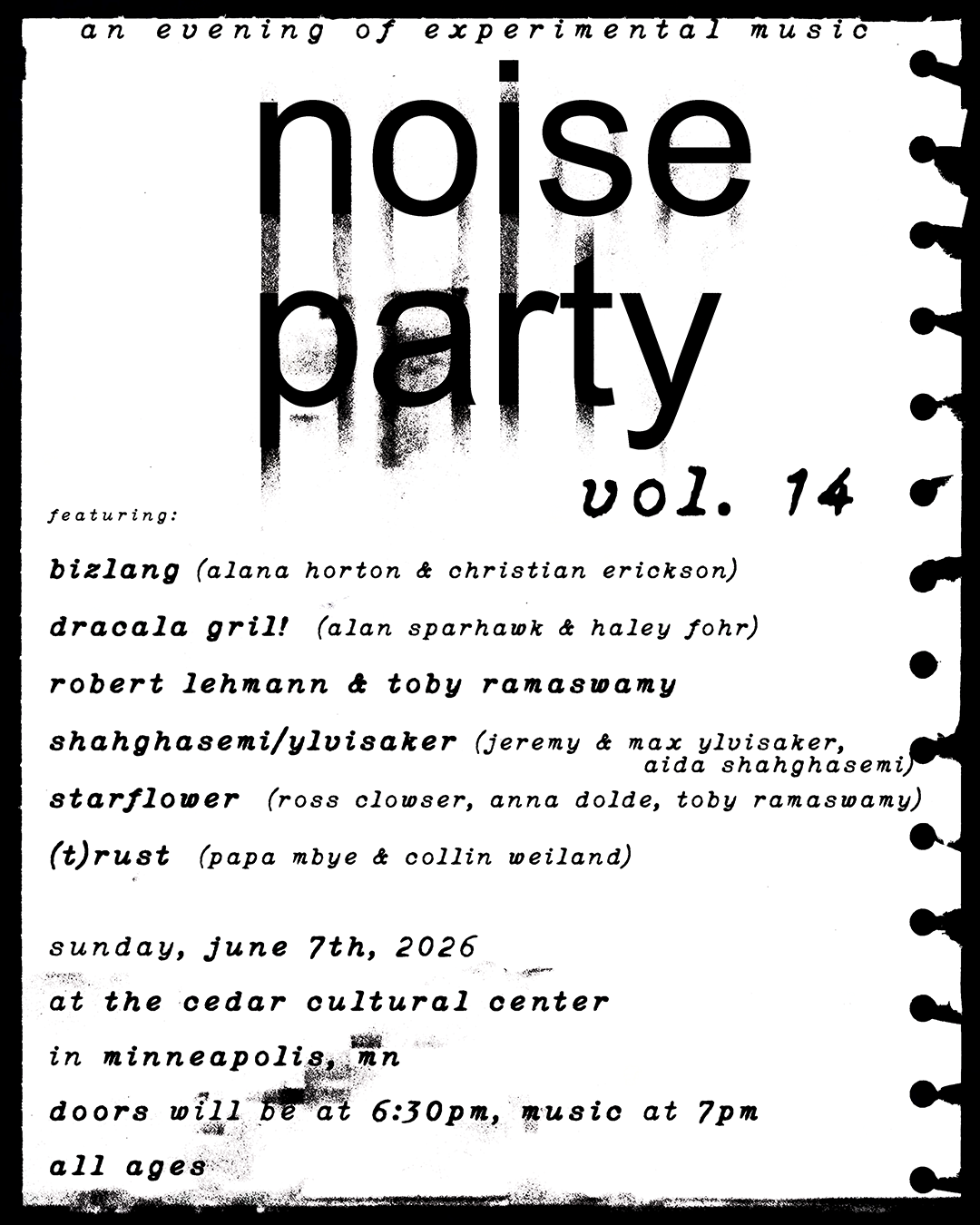 Noise Party 14 featuring BIZLANG (Alana Horton, Christian Erickson), Dracala Gril! (Alan Sparhawk, Haley Fohr), Shahghasemi/Ylvisaker (Jeremy & Max Ylvisaker, Aida Shahghasemi), Robert Lehmann & Toby Ramaswamy, starflower (Ross Clowser, Anna Dolde, Toby Ramaswamy), (t)rust (Papa Mbye, Collin Weiland)